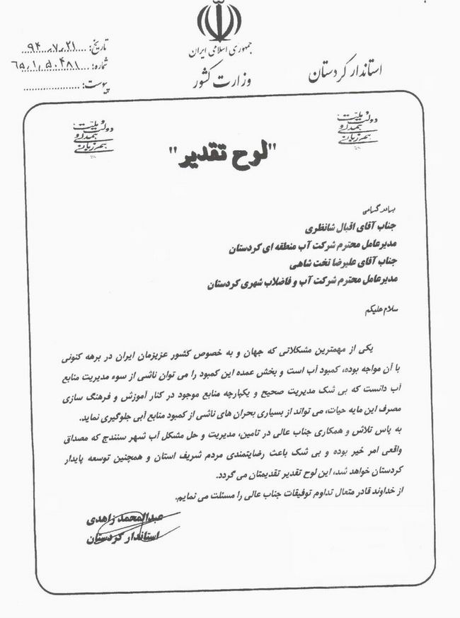 عبدالمحمد زاهدی طی این نامه اظهار داشته بی شک مدیریت صحیح و یکپارچه منابع موجود در کنار آموزش و فرهنگ سازی مصرف این مایه حیات، می تواند از بحران های ناشی از کمبود منابع آبی جلوگیری کند لذا به پاس تلاش و همکاری در رفع این مشکل که باعث رضایتمندی مردم شریف استان و توسعه پایدار کردستان خواهد شد، این لوح تقدیر تقدیم تان می گردد.